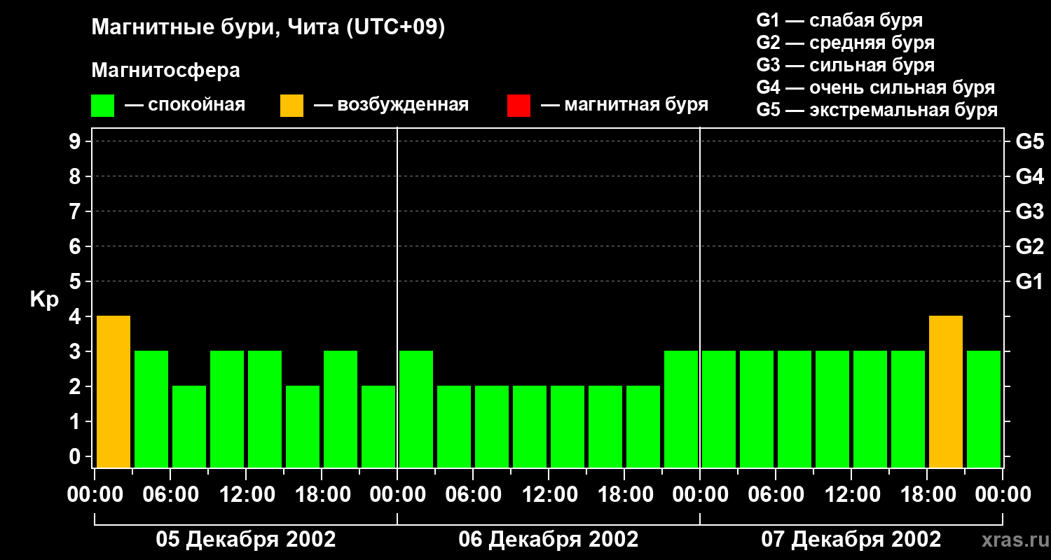 Изменения геомагнитного индекса Kp с 5 по 7 декабря 2002 года для средних широт