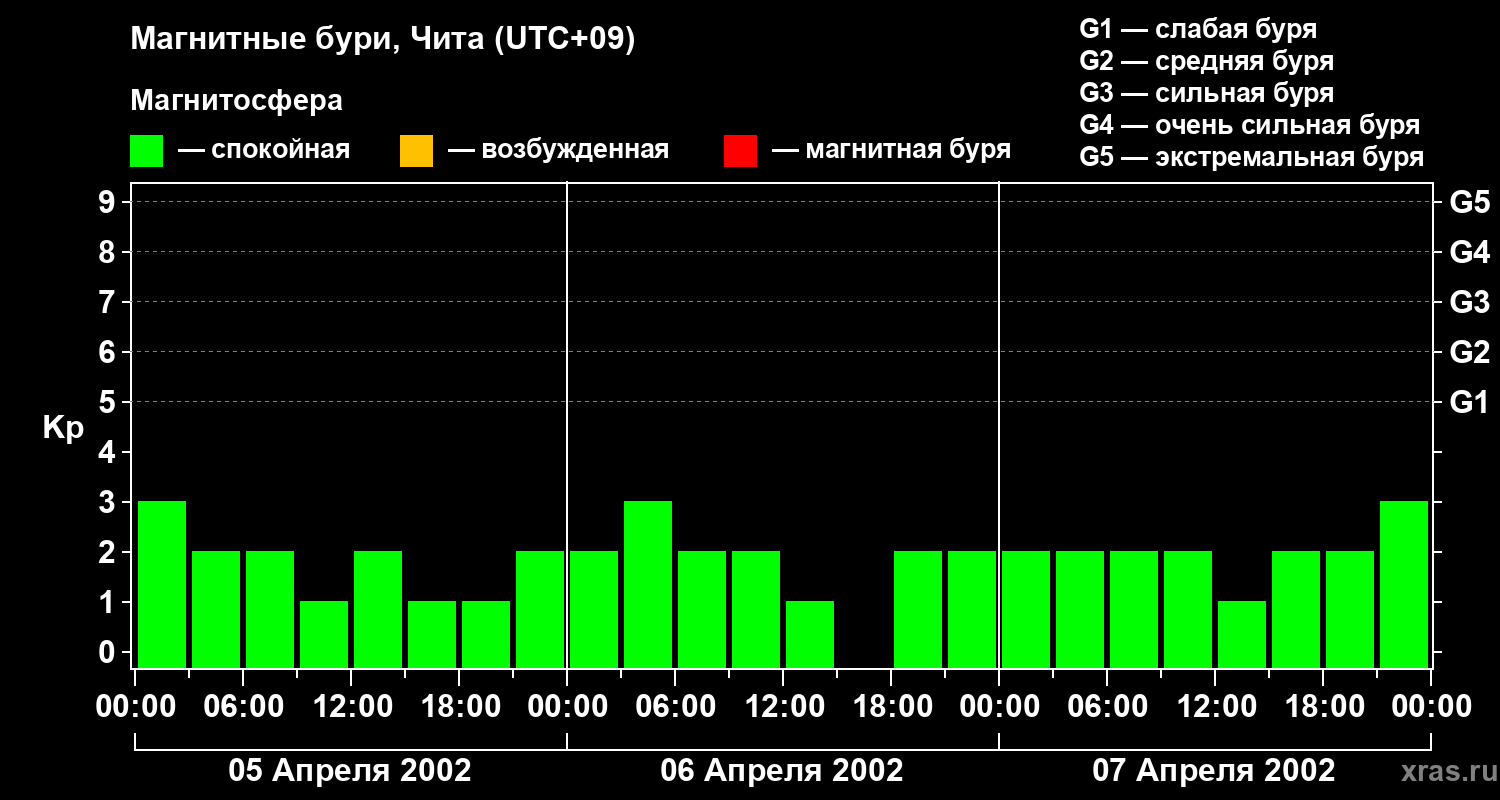 Изменения геомагнитного индекса Kp с 5 по 7 апреля 2002 года для средних широт