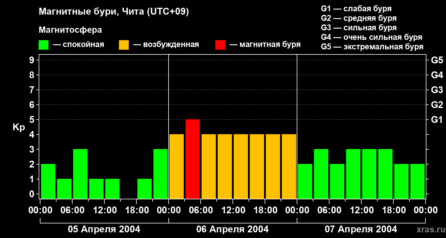Изменения геомагнитного индекса Kp с 5 по 7 апреля 2004 года для средних широт