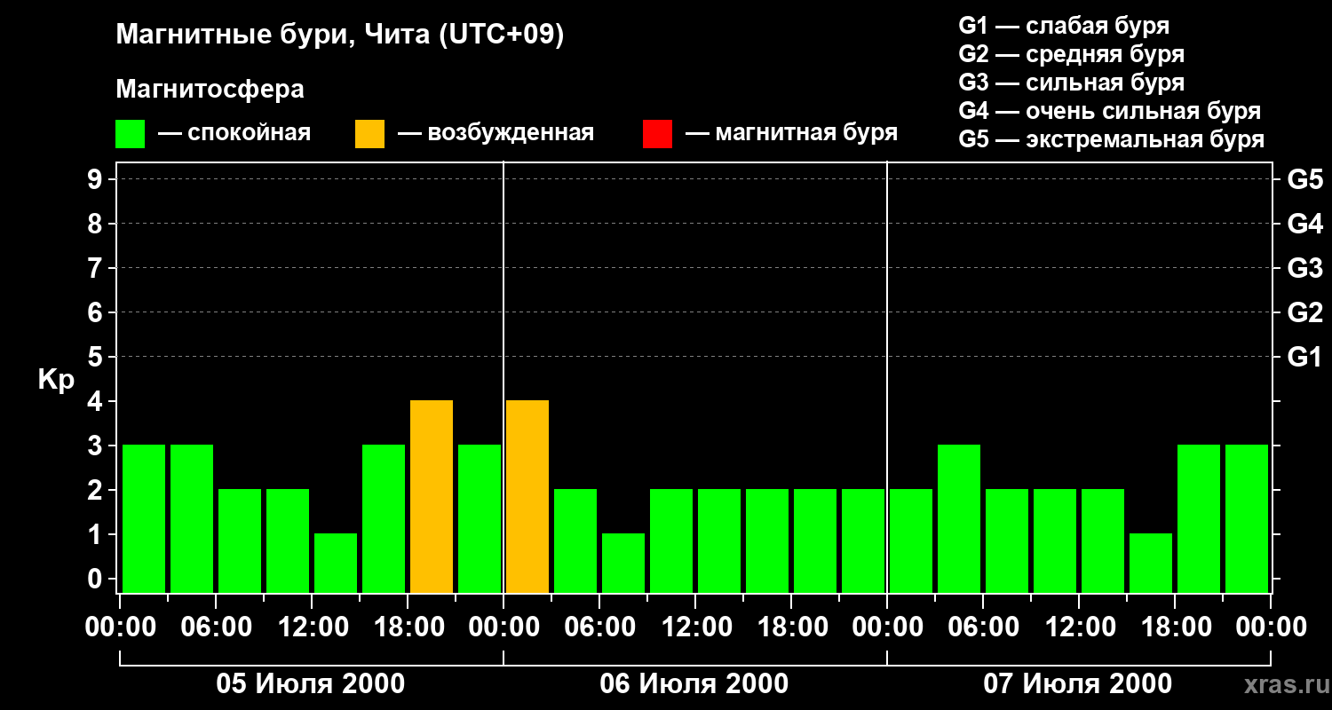 Изменения геомагнитного индекса Kp с 5 по 7 июля 2000 года для средних широт