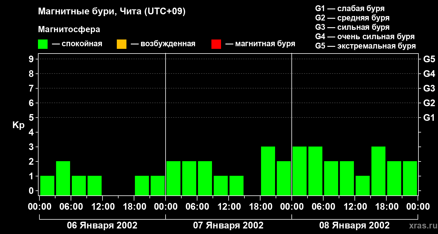 Изменения геомагнитного индекса Kp с 6 по 8 января 2002 года для средних широт