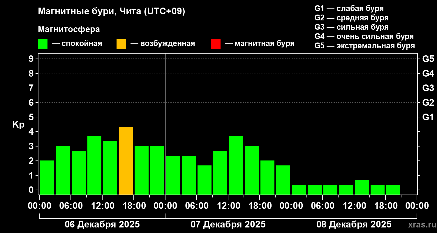 Изменения геомагнитного индекса Kp с 6 по 8 декабря 2025 года для средних широт