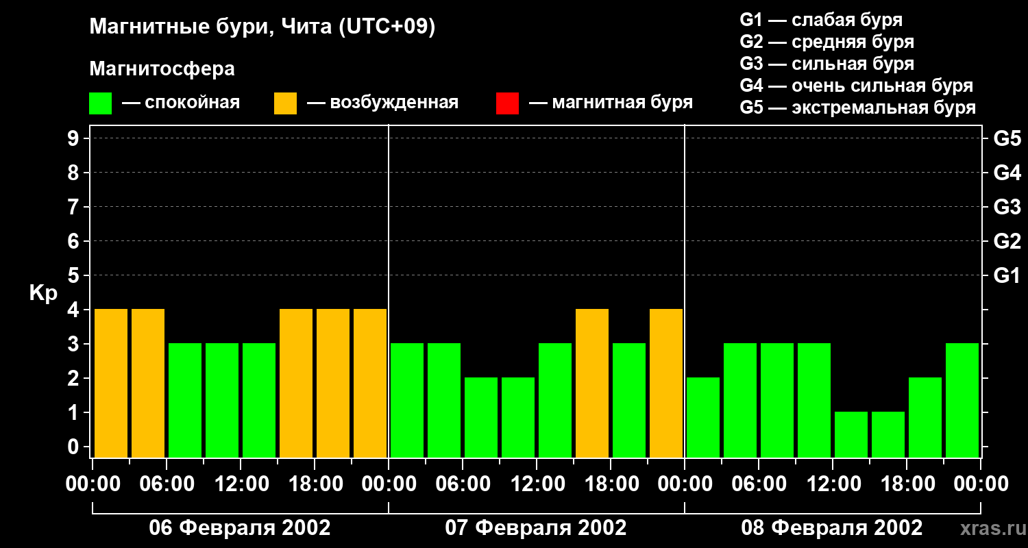Изменения геомагнитного индекса Kp с 6 по 8 февраля 2002 года для средних широт