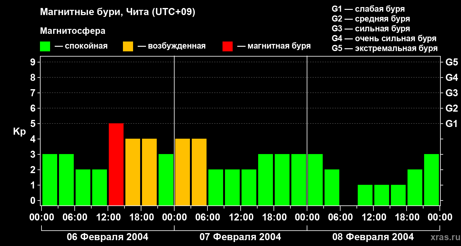 Изменения геомагнитного индекса Kp с 6 по 8 февраля 2004 года для средних широт