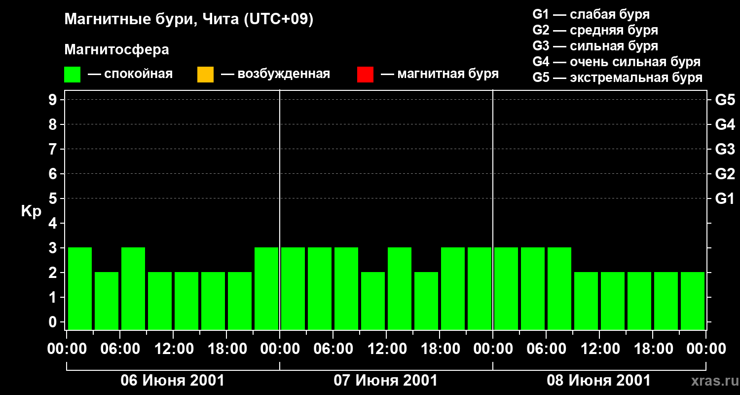 Изменения геомагнитного индекса Kp с 6 по 8 июня 2001 года для средних широт