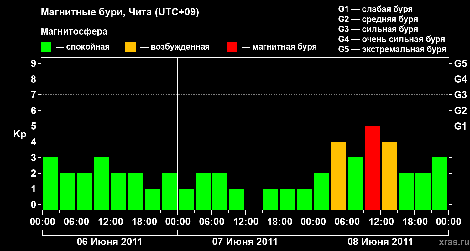 Изменения геомагнитного индекса Kp с 6 по 8 июня 2011 года для средних широт