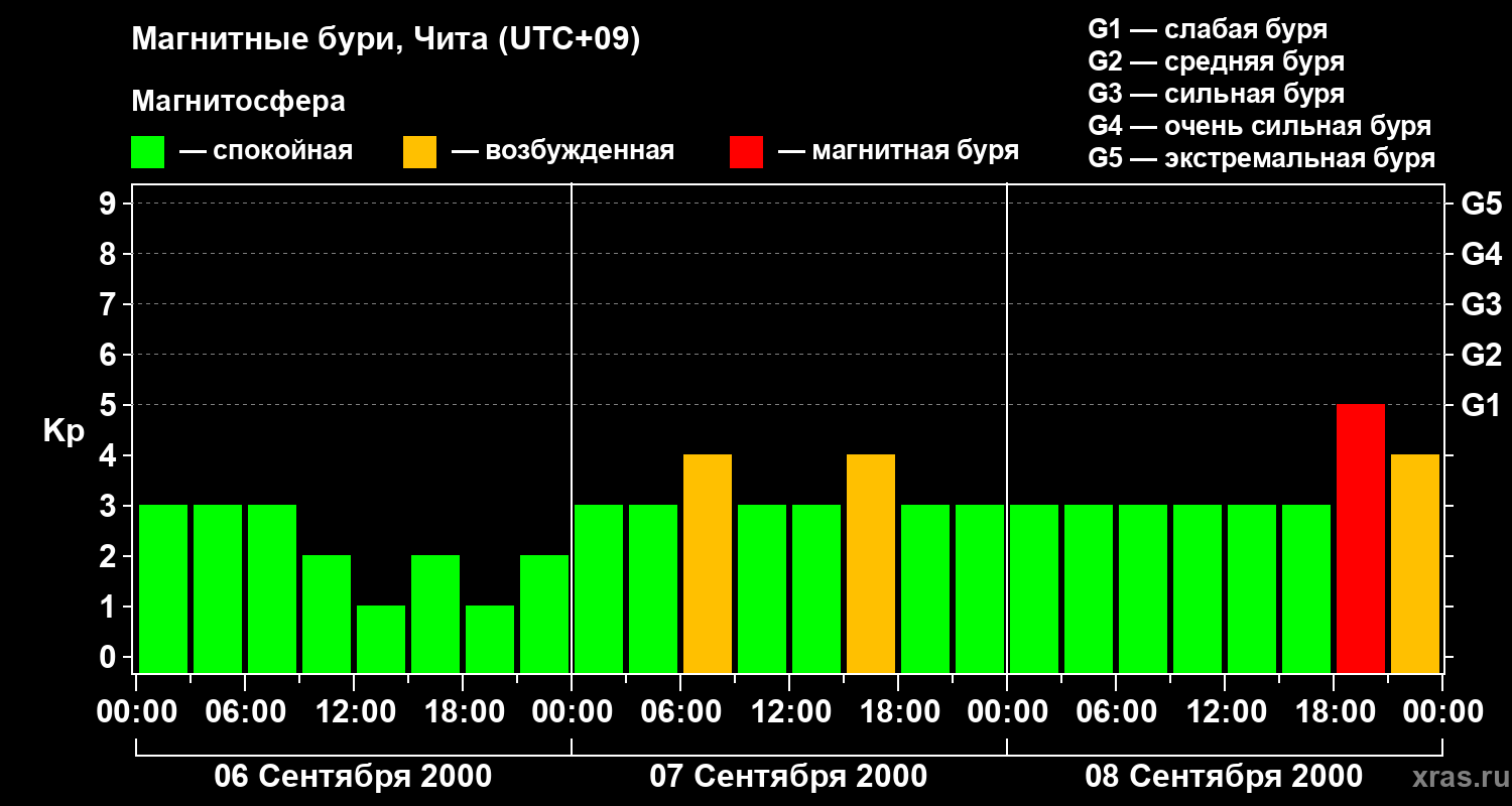 Изменения геомагнитного индекса Kp с 6 по 8 сентября 2000 года для средних широт