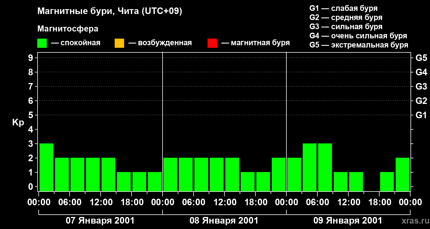 Изменения геомагнитного индекса Kp с 7 по 9 января 2001 года для средних широт