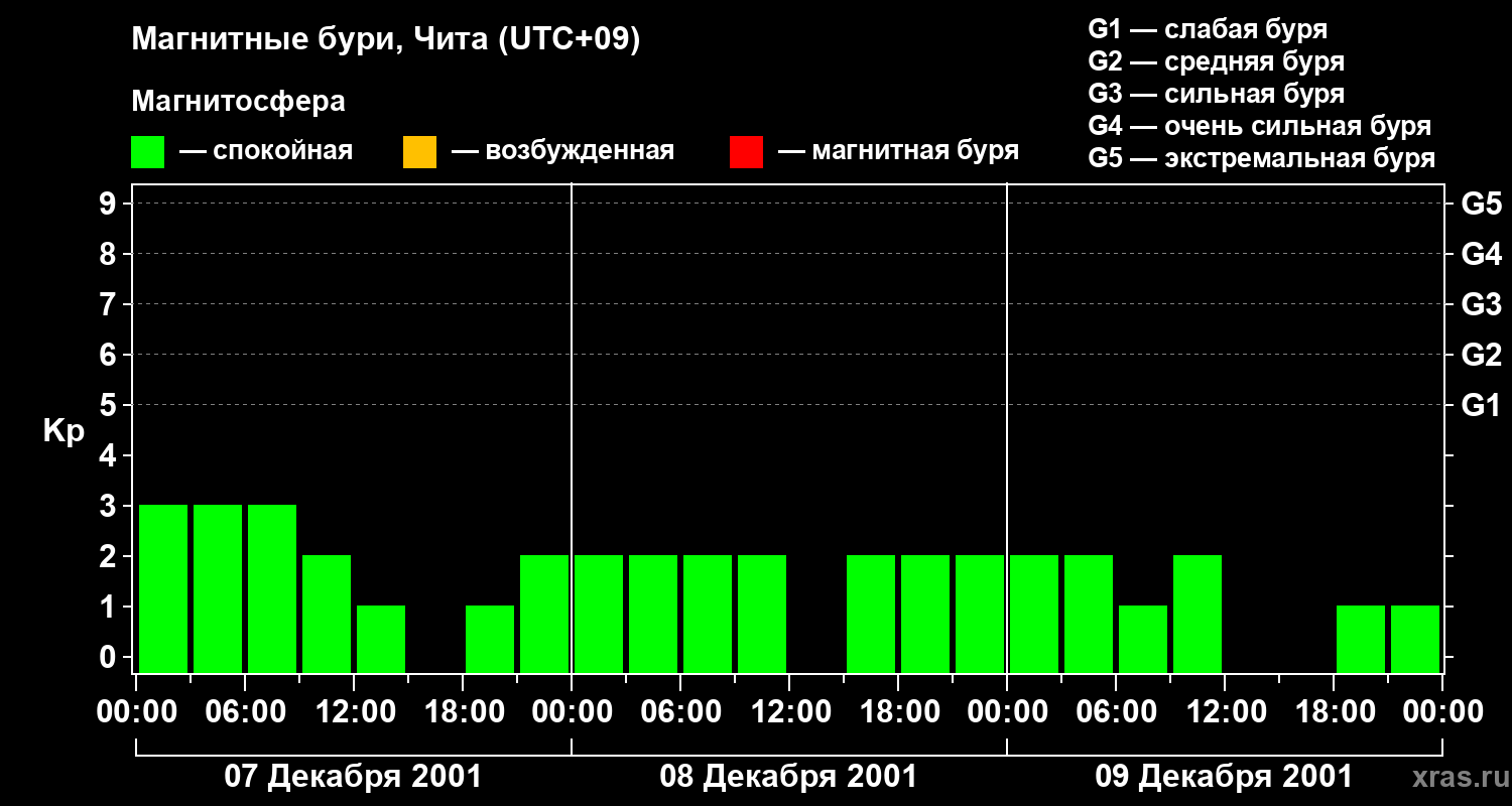Изменения геомагнитного индекса Kp с 7 по 9 декабря 2001 года для средних широт