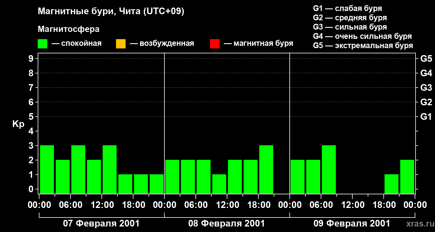 Изменения геомагнитного индекса Kp с 7 по 9 февраля 2001 года для средних широт