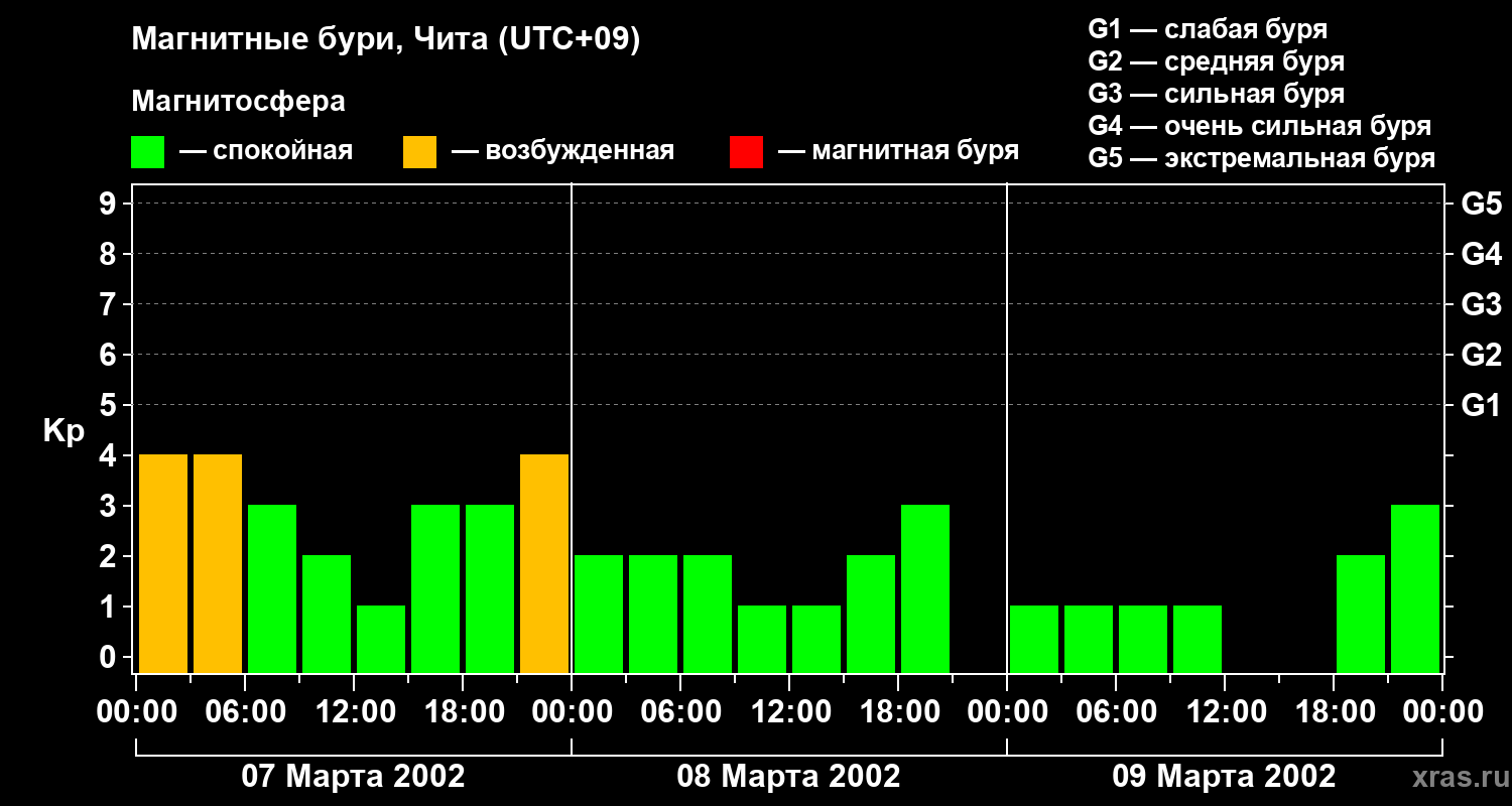 Изменения геомагнитного индекса Kp с 7 по 9 марта 2002 года для средних широт