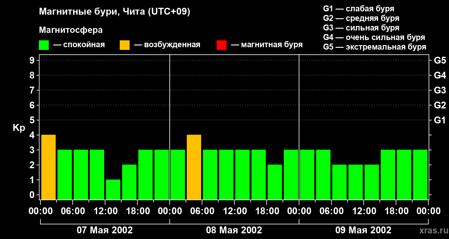 Изменения геомагнитного индекса Kp с 7 по 9 мая 2002 года для средних широт