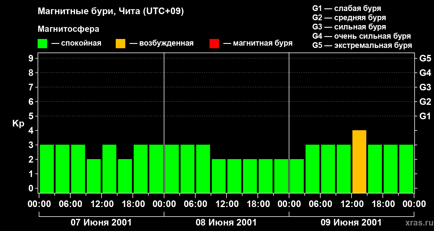 Изменения геомагнитного индекса Kp с 7 по 9 июня 2001 года для средних широт
