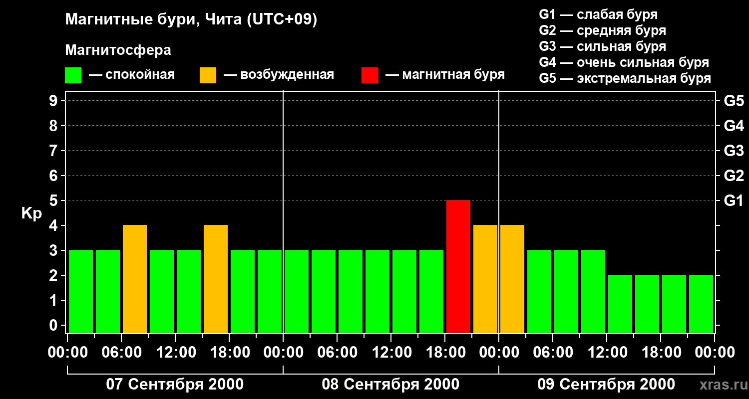 Изменения геомагнитного индекса Kp с 7 по 9 сентября 2000 года для средних широт