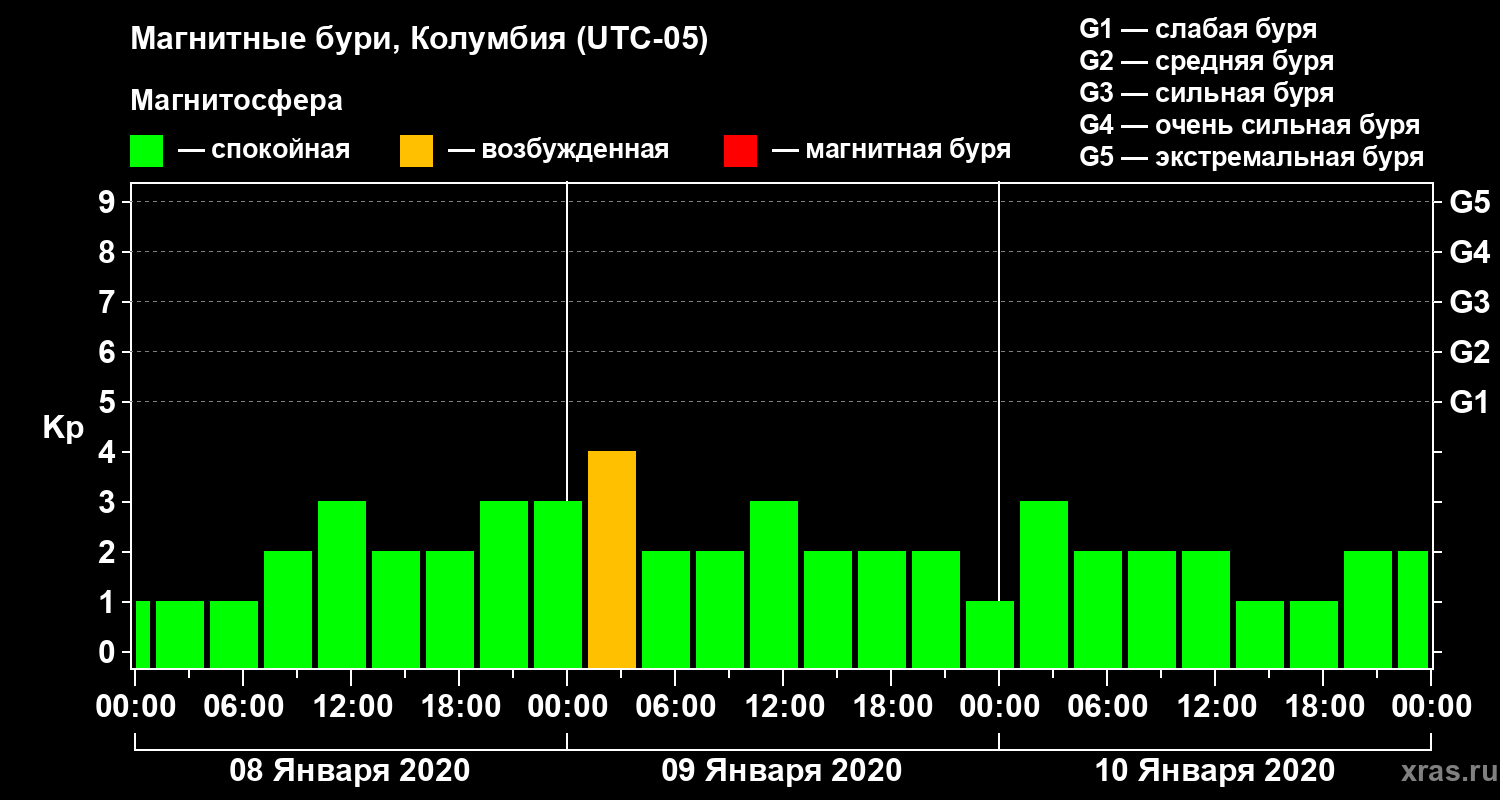 Изменения геомагнитного индекса Kp с 8 по 10 января 2020 года для средних широт