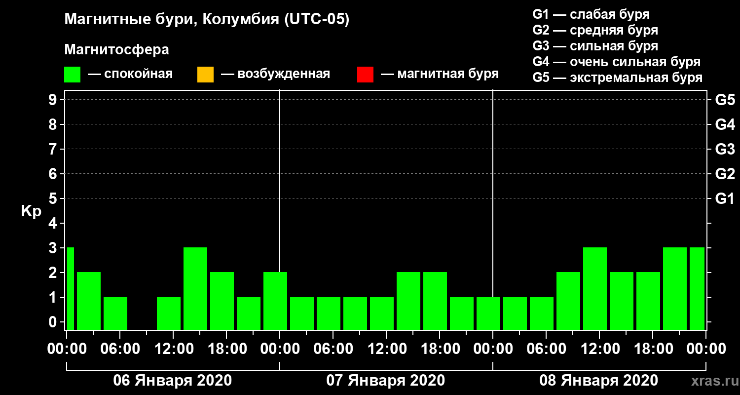 Изменения геомагнитного индекса Kp с 6 по 8 января 2020 года для средних широт