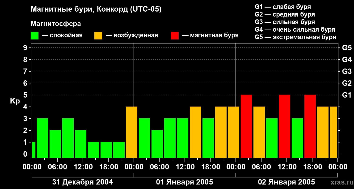 Изменения геомагнитного индекса Kp с 31 декабря 2004 года по 2 января 2005 года для средних широт