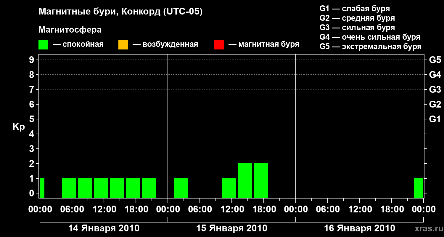Изменения геомагнитного индекса Kp с 14 по 16 января 2010 года для средних широт