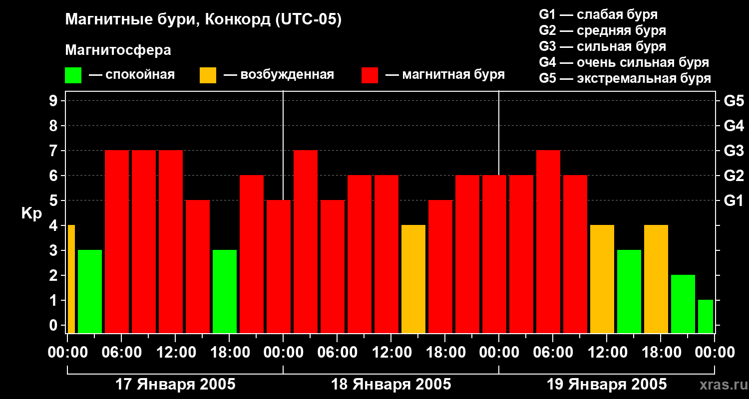Изменения геомагнитного индекса Kp с 17 по 19 января 2005 года для средних широт