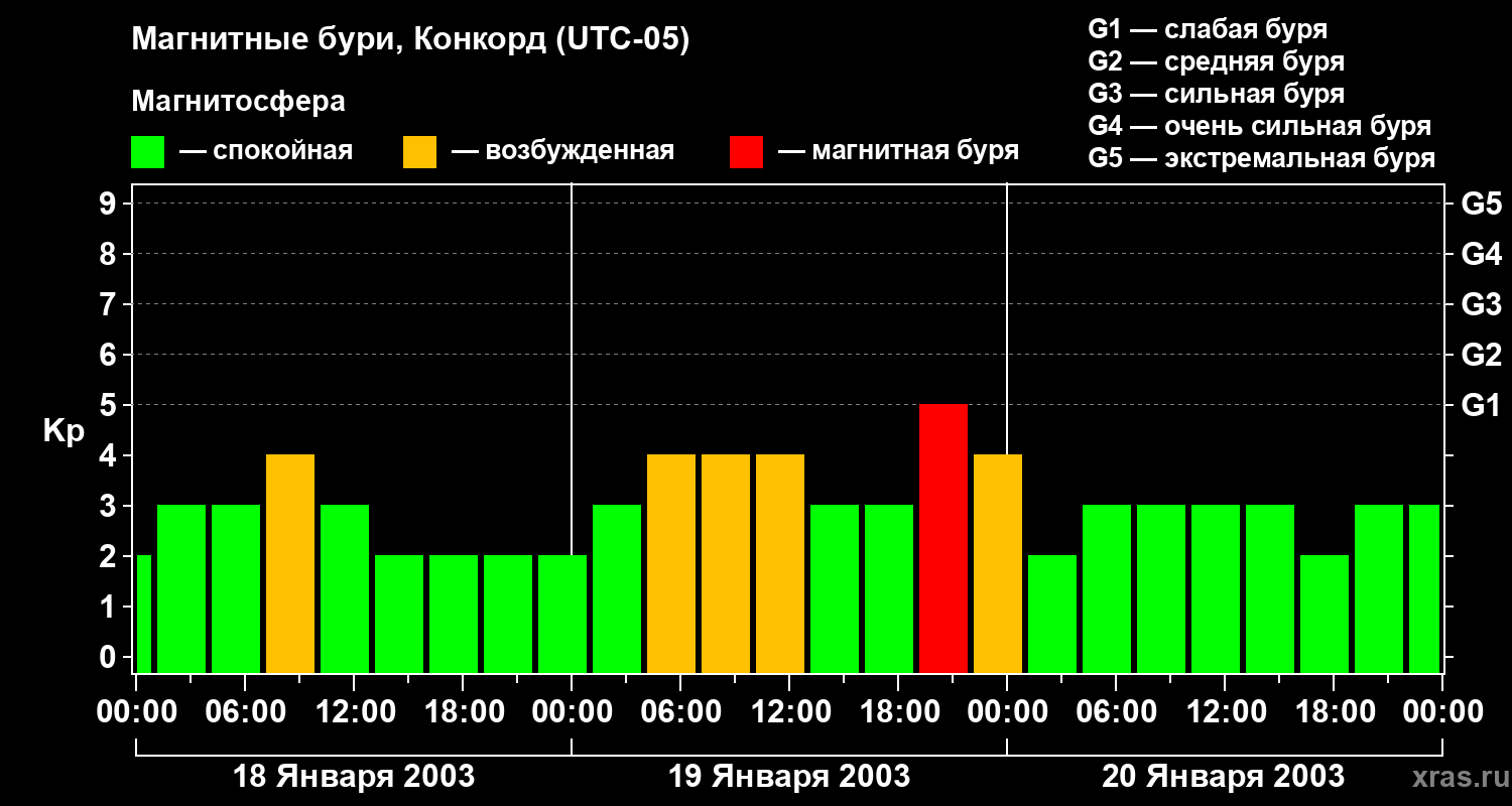 Изменения геомагнитного индекса Kp с 18 по 20 января 2003 года для средних широт