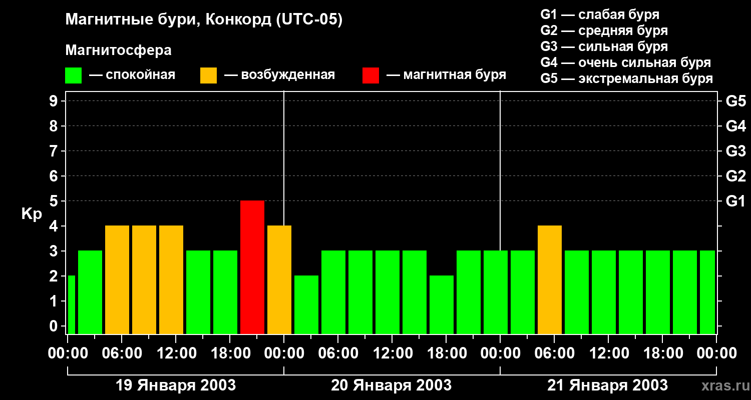 Изменения геомагнитного индекса Kp с 19 по 21 января 2003 года для средних широт