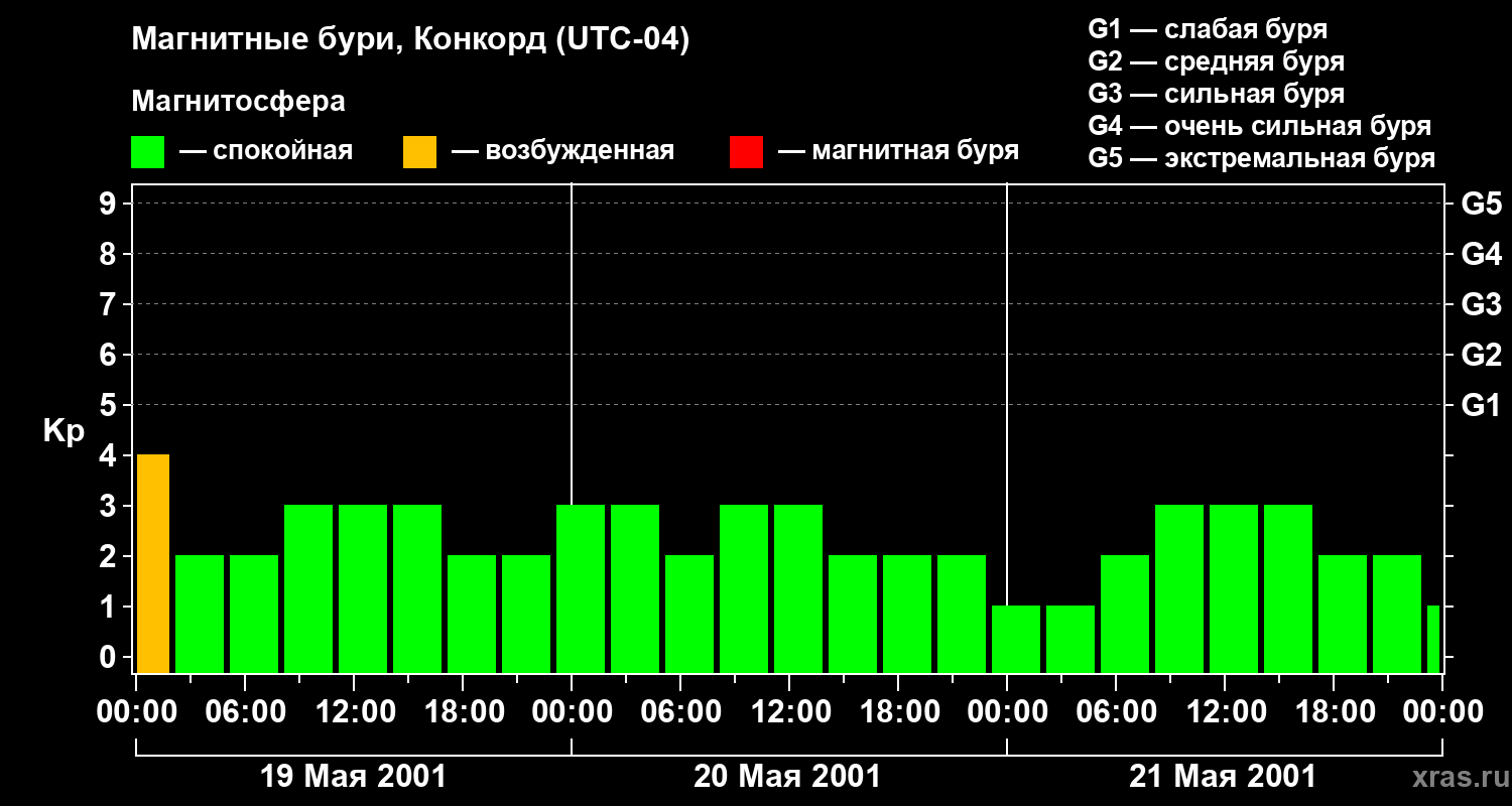 Изменения геомагнитного индекса Kp с 19 по 21 мая 2001 года для средних широт