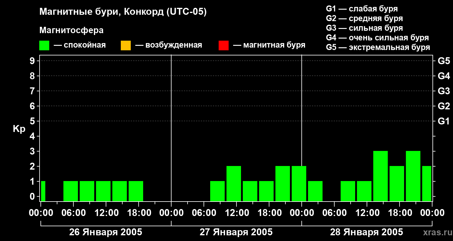 Изменения геомагнитного индекса Kp с 26 по 28 января 2005 года для средних широт