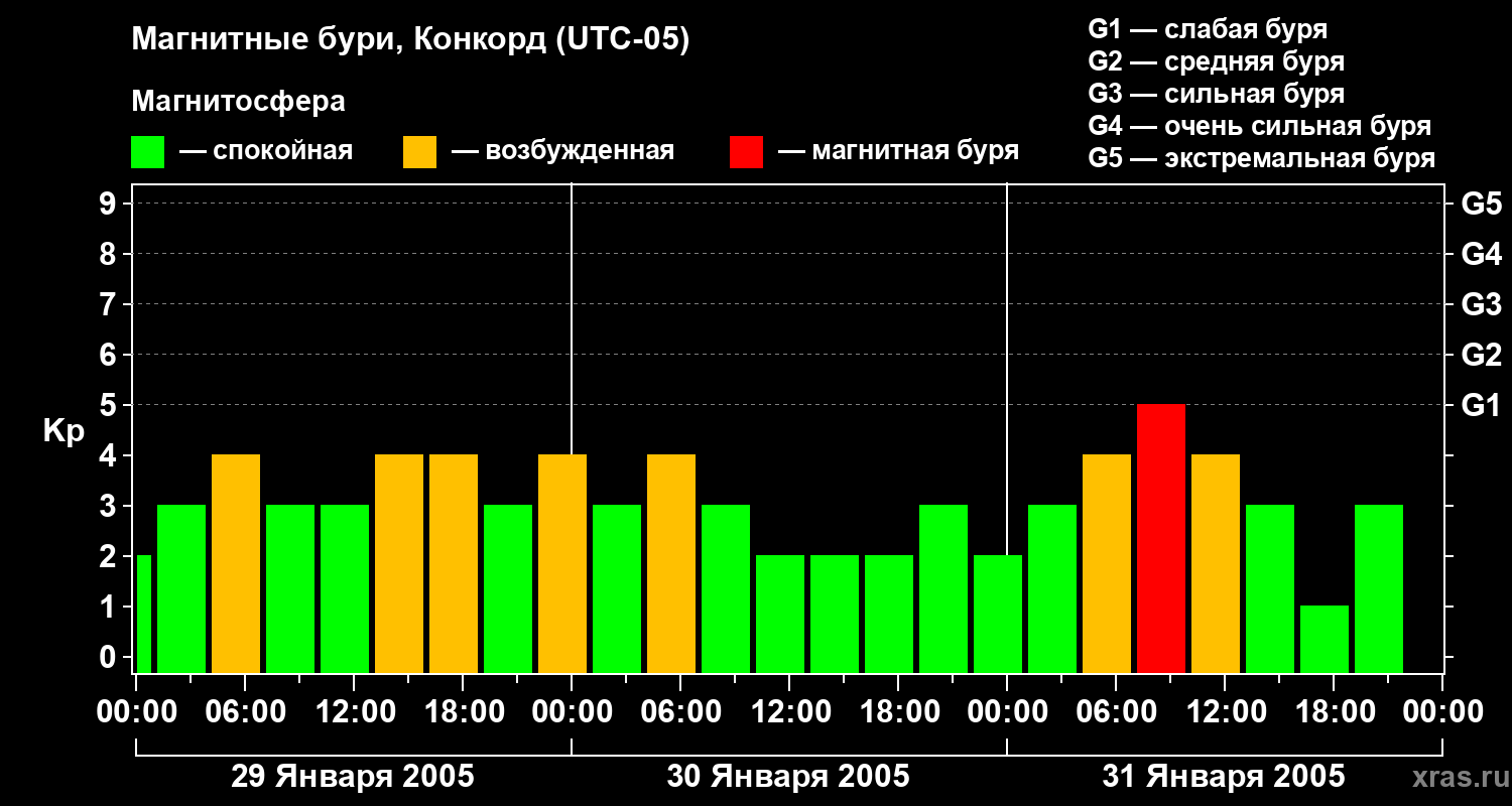 Изменения геомагнитного индекса Kp с 29 по 31 января 2005 года для средних широт