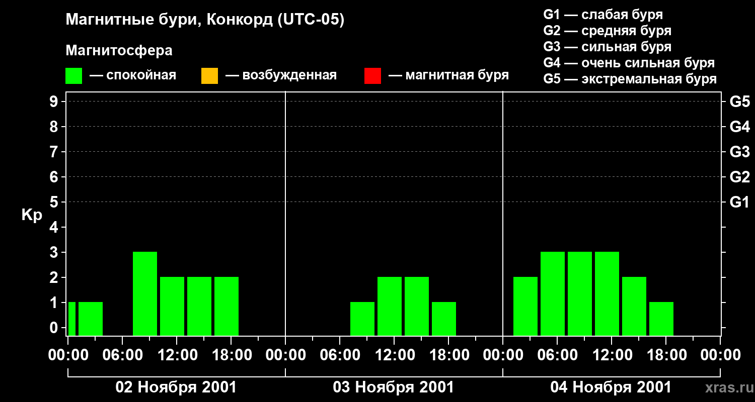 Изменения геомагнитного индекса Kp с 2 по 4 ноября 2001 года для средних широт