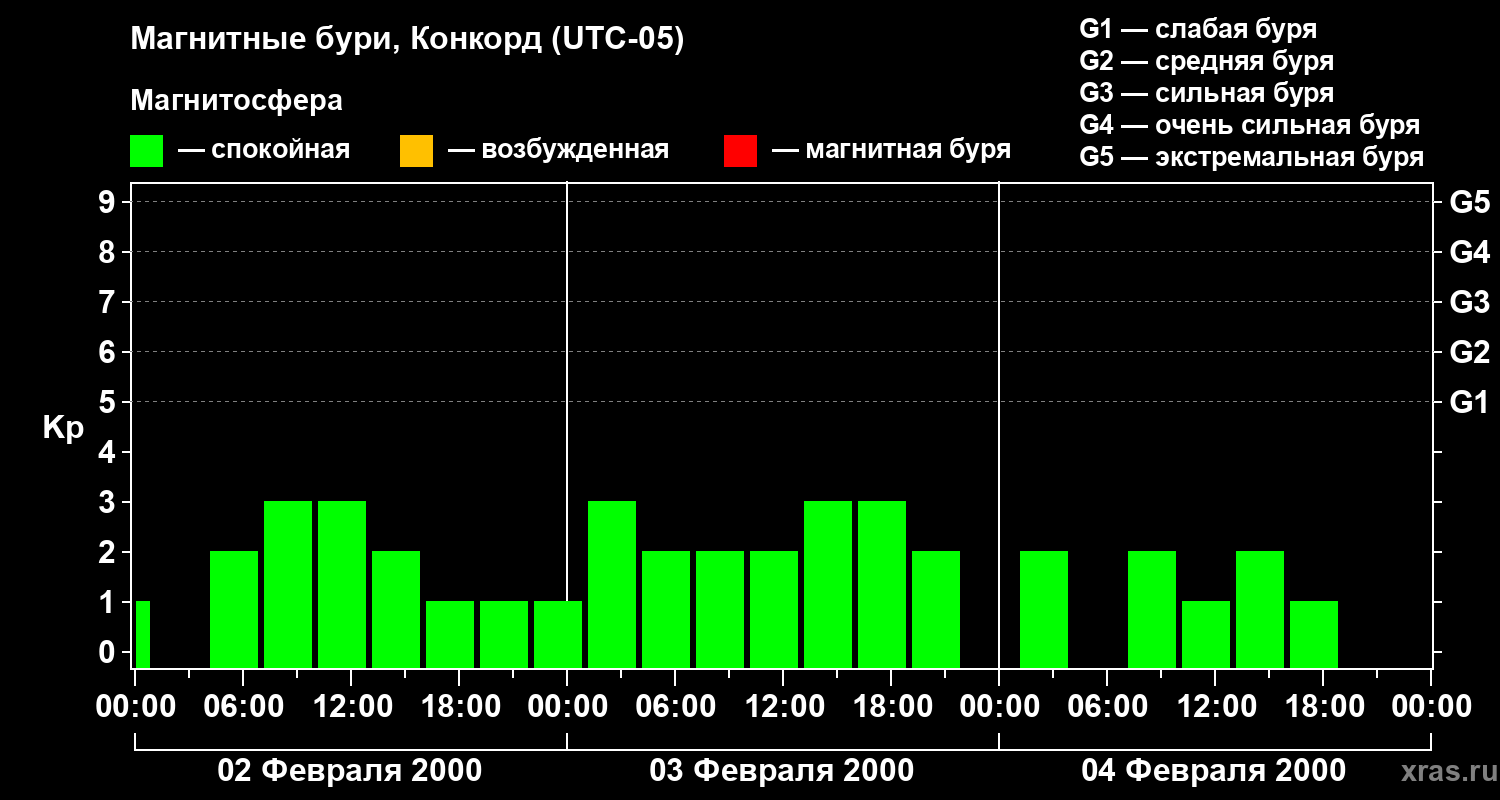Изменения геомагнитного индекса Kp с 2 по 4 февраля 2000 года для средних широт