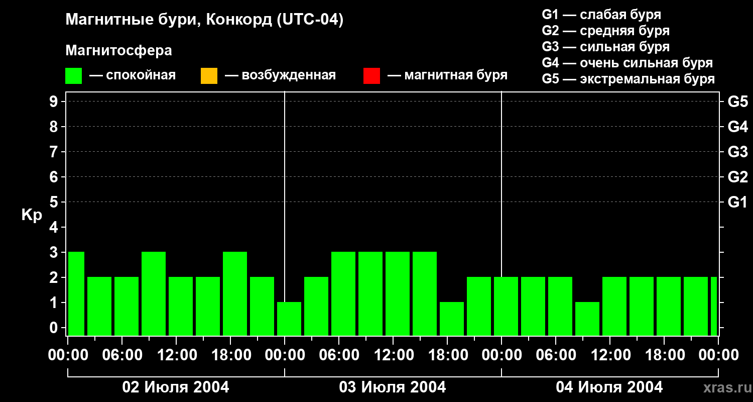 Изменения геомагнитного индекса Kp с 2 по 4 июля 2004 года для средних широт