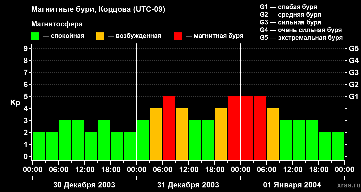 Изменения геомагнитного индекса Kp с 30 декабря 2003 года по 1 января 2004 года для средних широт