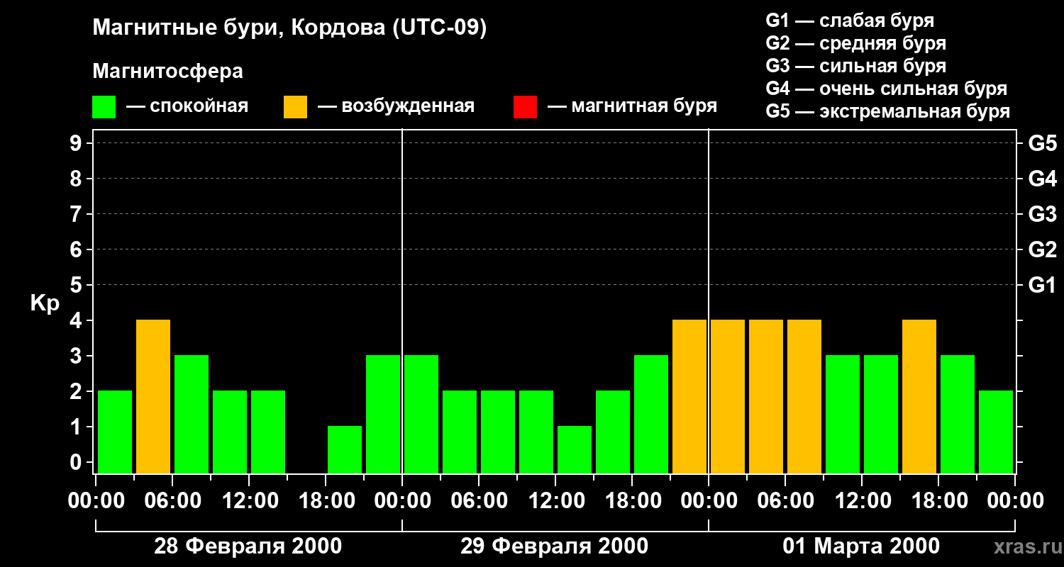 Изменения геомагнитного индекса Kp с 28 февраля по 1 марта 2000 года для средних широт