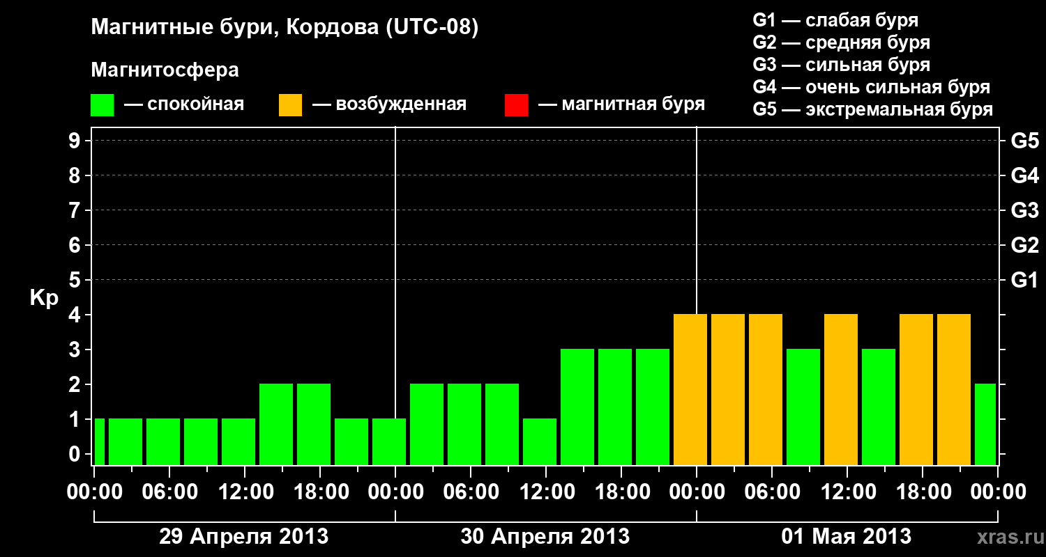 Изменения геомагнитного индекса Kp с 29 апреля по 1 мая 2013 года для средних широт