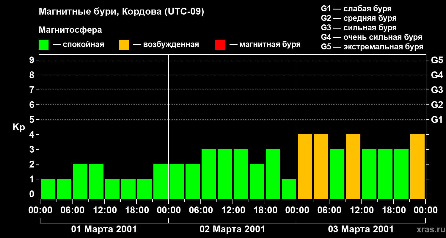 Изменения геомагнитного индекса Kp с 1 по 3 марта 2001 года для средних широт