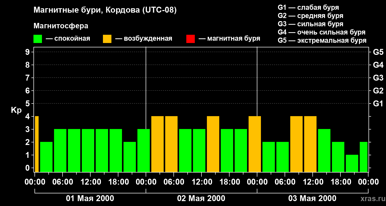 Изменения геомагнитного индекса Kp с 1 по 3 мая 2000 года для средних широт