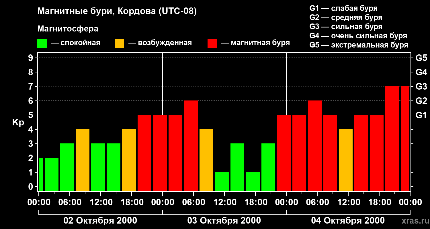 Изменения геомагнитного индекса Kp с 2 по 4 октября 2000 года для средних широт