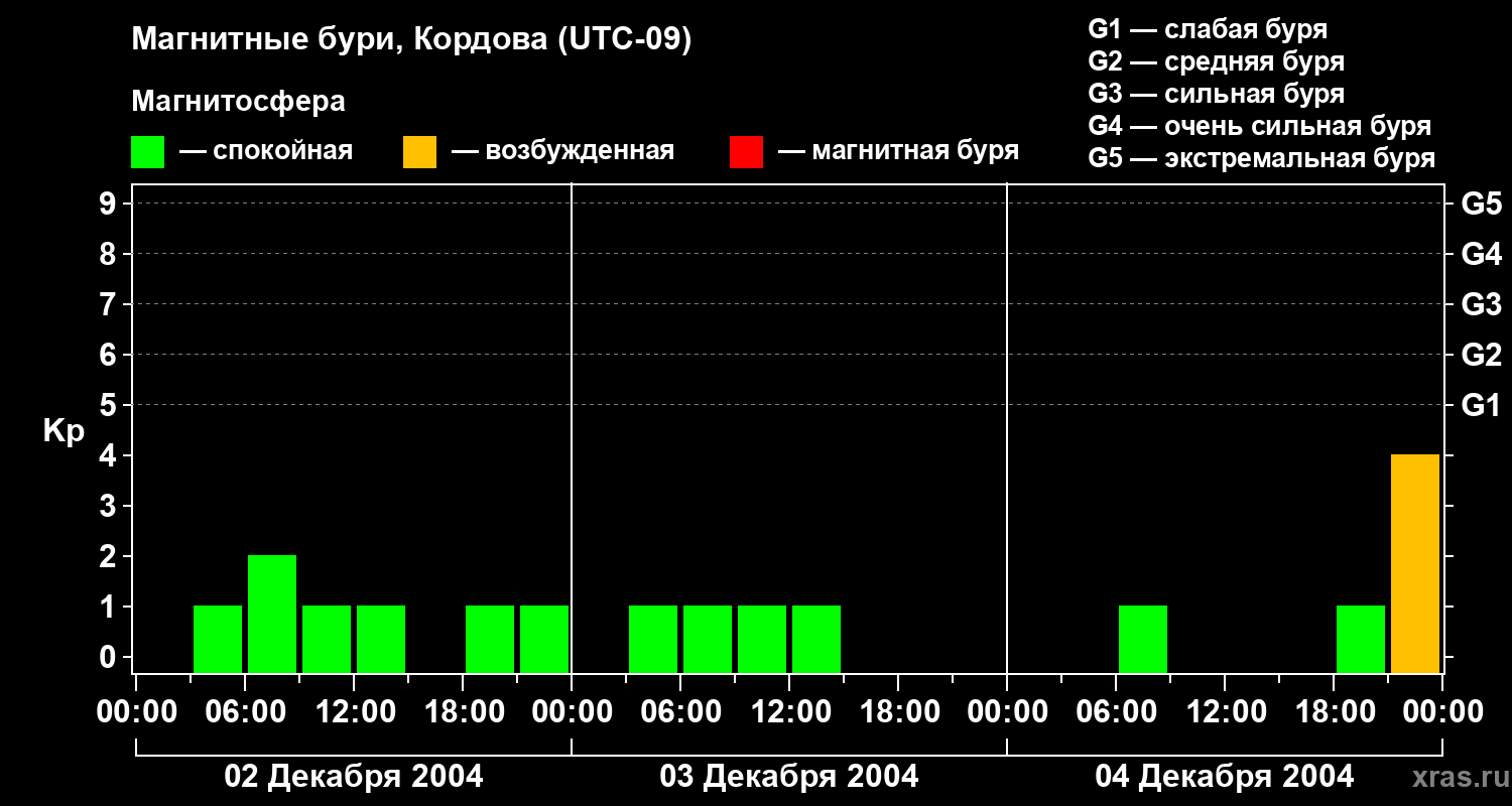 Изменения геомагнитного индекса Kp с 2 по 4 декабря 2004 года для средних широт
