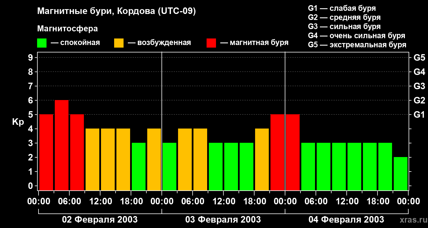 Изменения геомагнитного индекса Kp с 2 по 4 февраля 2003 года для средних широт