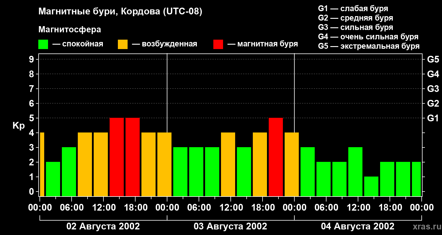 Изменения геомагнитного индекса Kp с 2 по 4 августа 2002 года для средних широт