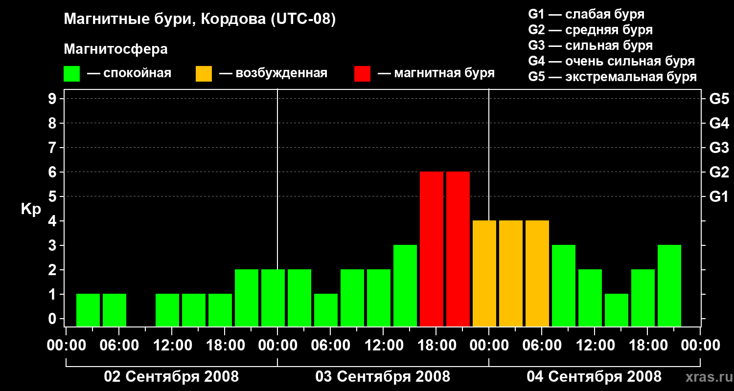 Изменения геомагнитного индекса Kp с 2 по 4 сентября 2008 года для средних широт