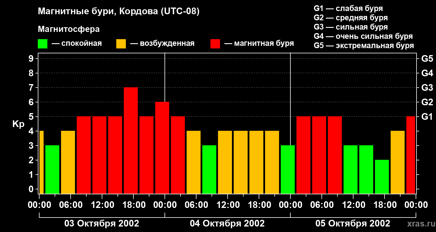 Изменения геомагнитного индекса Kp с 3 по 5 октября 2002 года для средних широт