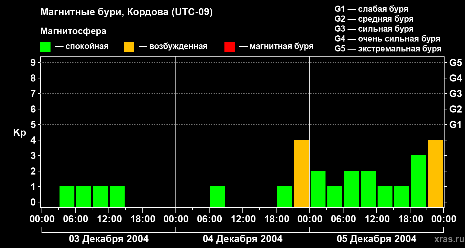 Изменения геомагнитного индекса Kp с 3 по 5 декабря 2004 года для средних широт