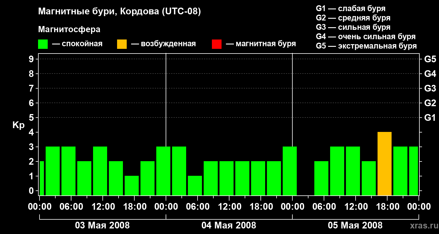 Изменения геомагнитного индекса Kp с 3 по 5 мая 2008 года для средних широт