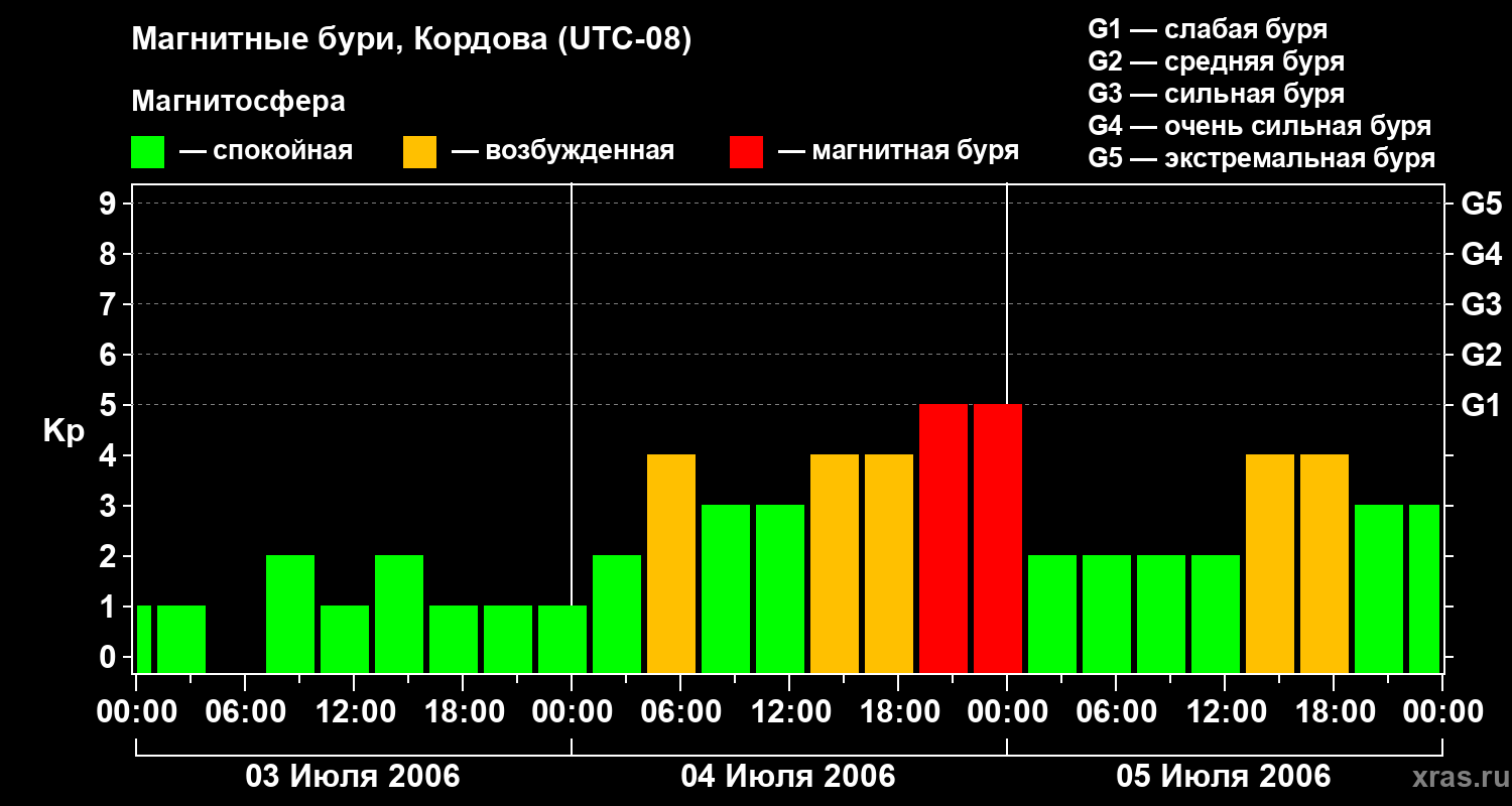 Изменения геомагнитного индекса Kp с 3 по 5 июля 2006 года для средних широт