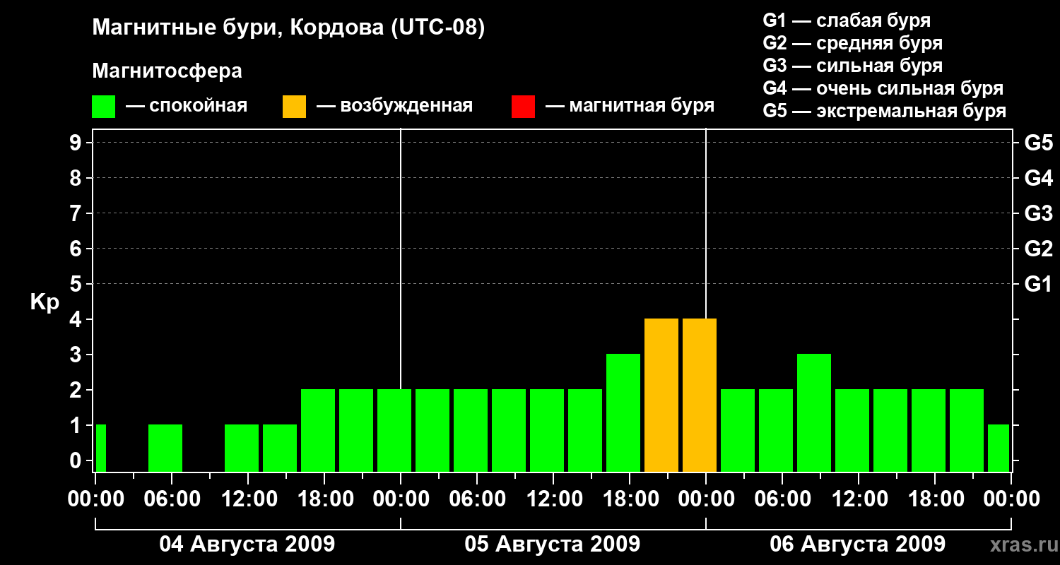 Изменения геомагнитного индекса Kp с 4 по 6 августа 2009 года для средних широт