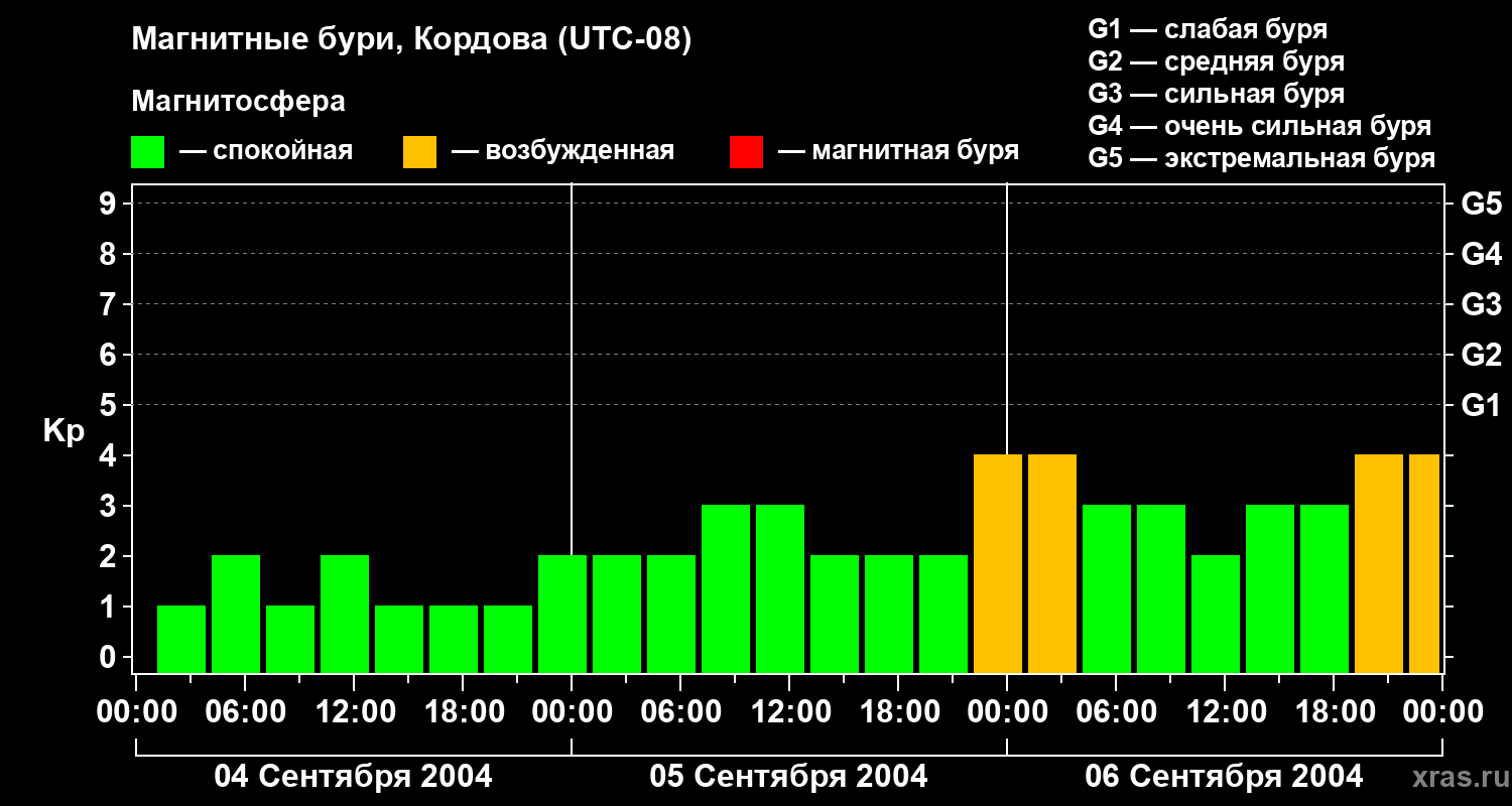 Изменения геомагнитного индекса Kp с 4 по 6 сентября 2004 года для средних широт