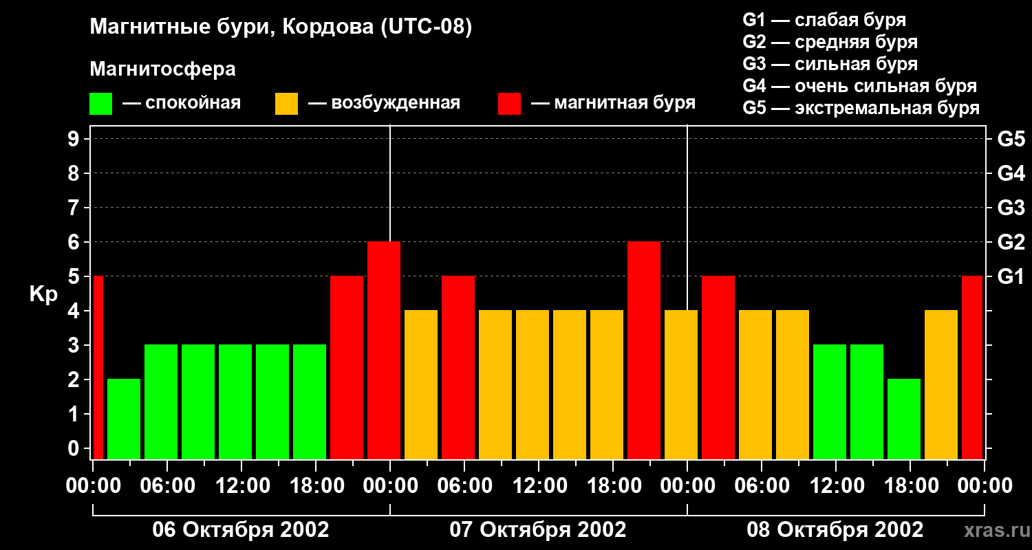 Изменения геомагнитного индекса Kp с 6 по 8 октября 2002 года для средних широт