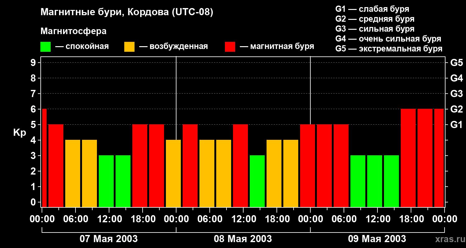 Изменения геомагнитного индекса Kp с 7 по 9 мая 2003 года для средних широт