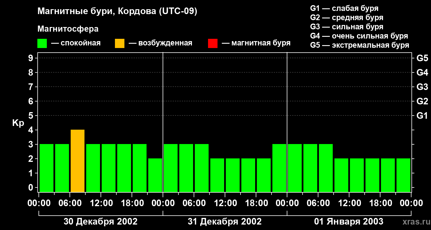 Изменения геомагнитного индекса Kp с 30 декабря 2002 года по 1 января 2003 года для средних широт